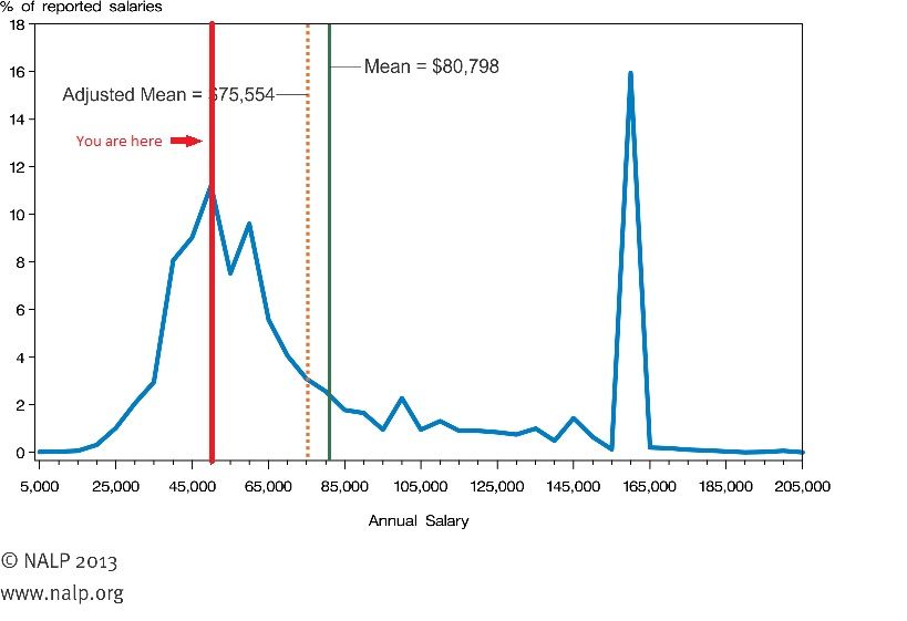 (2) As for salaries, one third of people who got jobs with firms didn't report a salary, or didn't have one imputed to them by their schools. The real median firm salary is therefore going to be somewhat lower -- and only half of all grads got firm jobs.